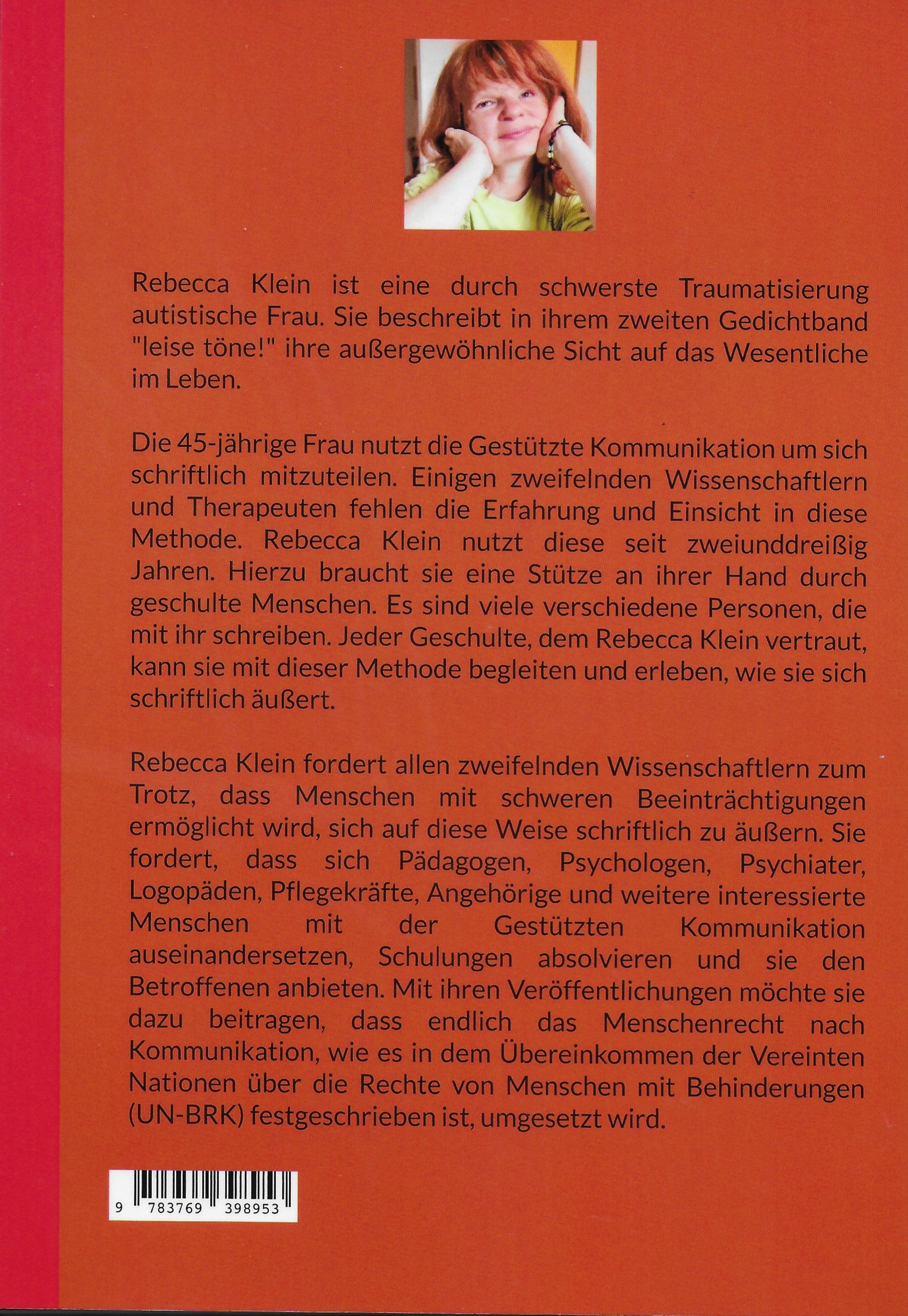 Rebecca Klein ist eine durch schwerste Traumatisierung autistische Frau. Sie beschreibt in ihrem zweiten Gedichtband „leise töne!“ ihre außergewöhnliche Sicht auf das Wesentliche im Leben.
